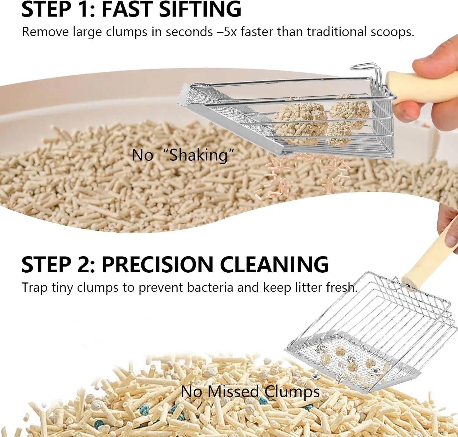 Make litter box cleaning easier with this Stainless Steel Litter Scoop. Designed for durability, it features a strong metal build that won’t bend or break. The dual-mesh sifter efficiently separates clean litter from waste. Its wooden handle provides a comfortable and sturdy grip during use. Perfect for quick and hygienic litter box maintenance. The included wall hook allows for convenient storage and easy access. Ideal for daily cleaning routines to keep your cat’s space fresh. The smooth surface makes it easy to rinse and clean after use. Suitable for all types of cat litter. Upgrade your pet care routine with a reliable and long-lasting litter scoop. 🐱🧹✨
